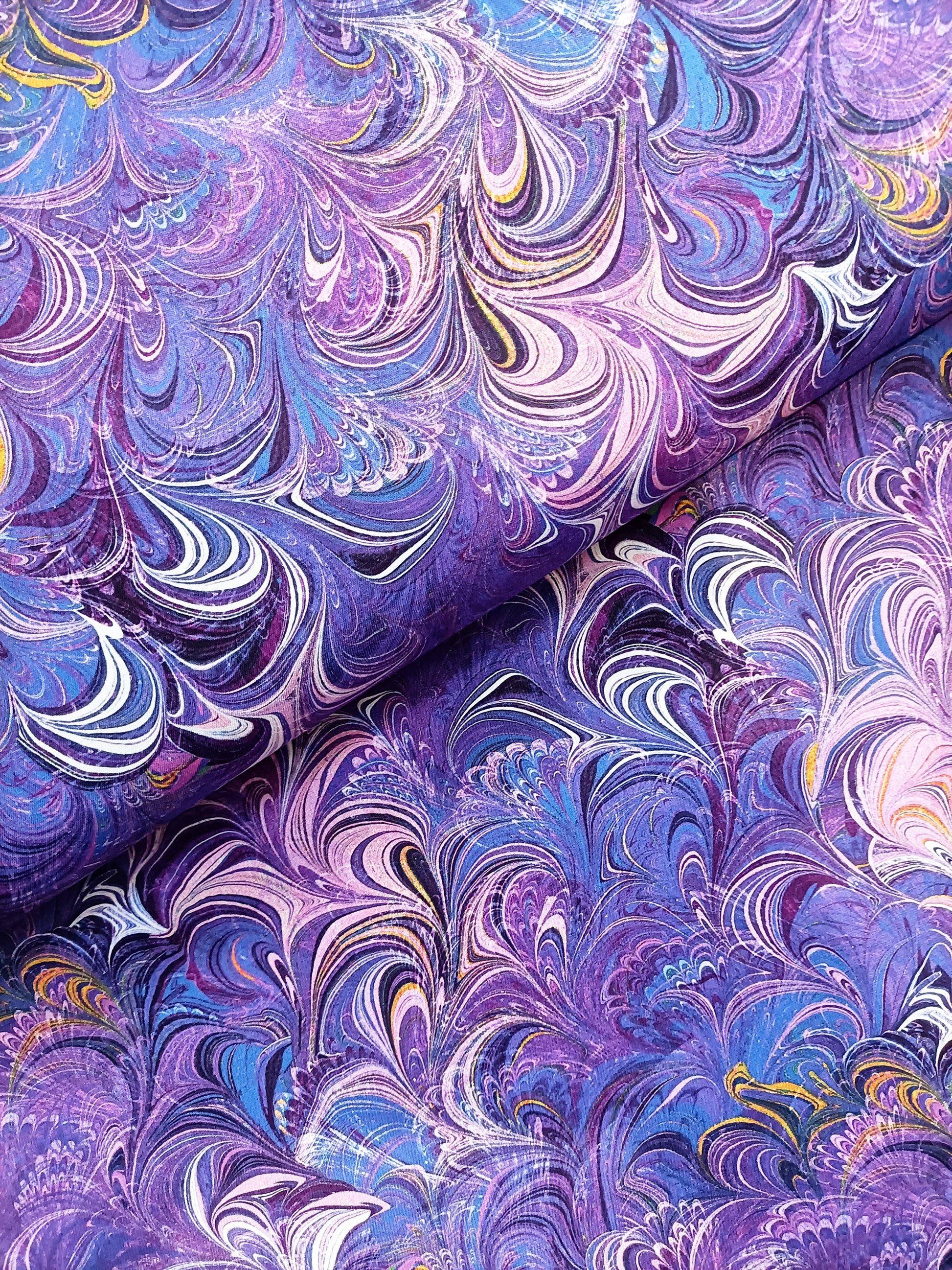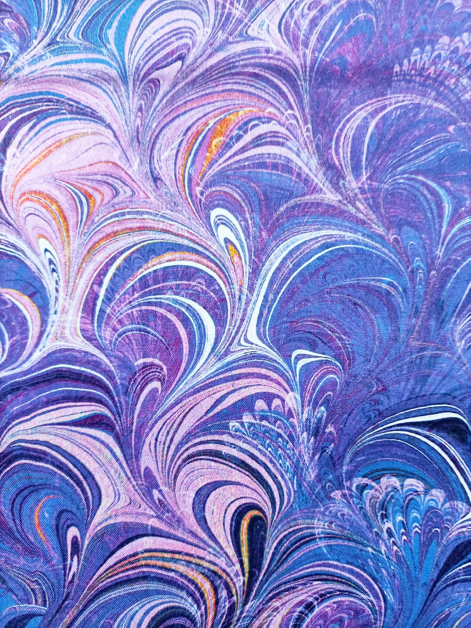 A beautiful design of colourful poured paint. From a distance the fabric looks like large swishes of paint, but a closer view brings up a more intricate design of swirls and almost wing and tail shapes underneath.