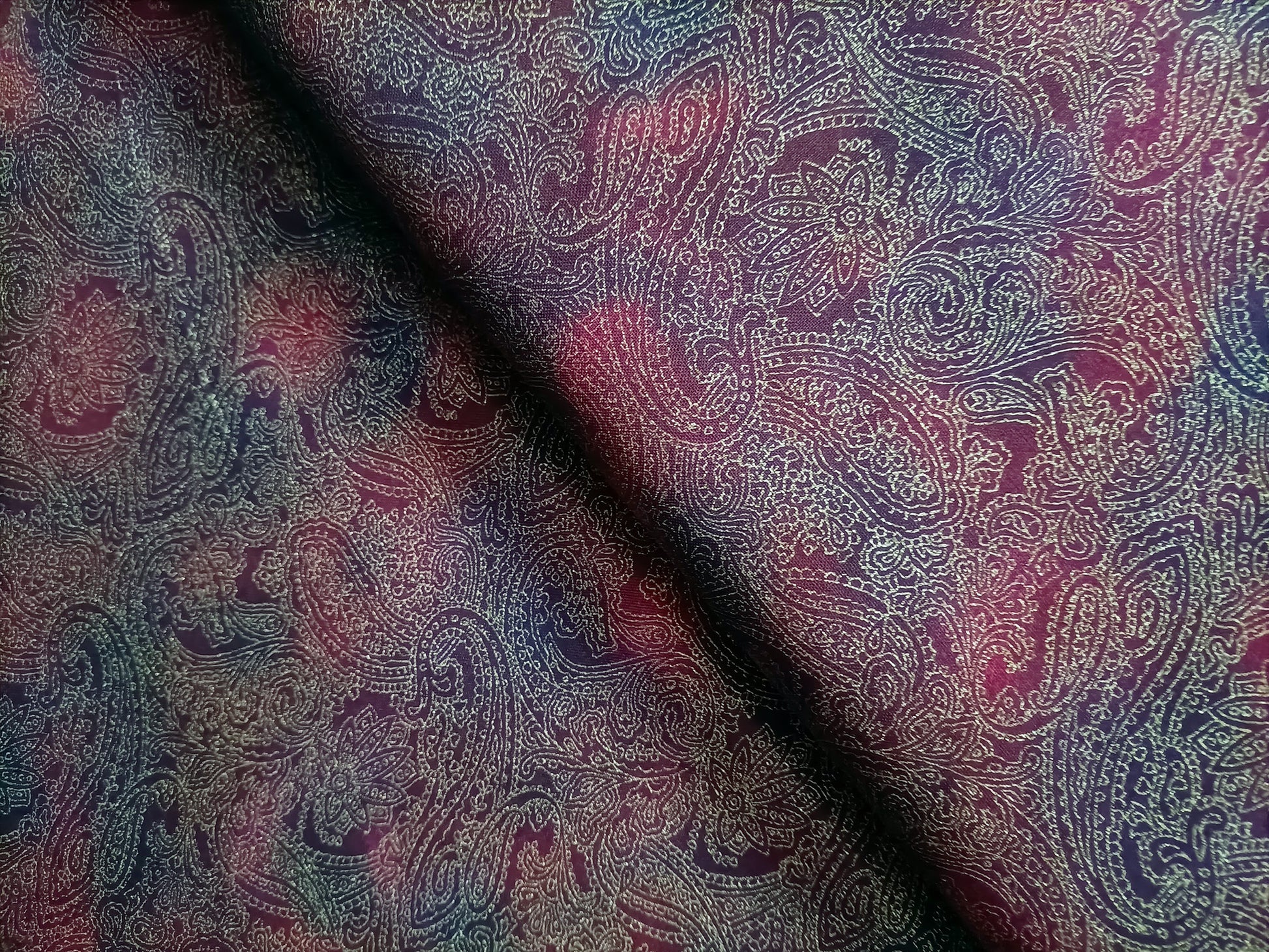 A metallic paisley design over dark red and maroon fabric. Perfect Christmas fabric for holiday sewing.