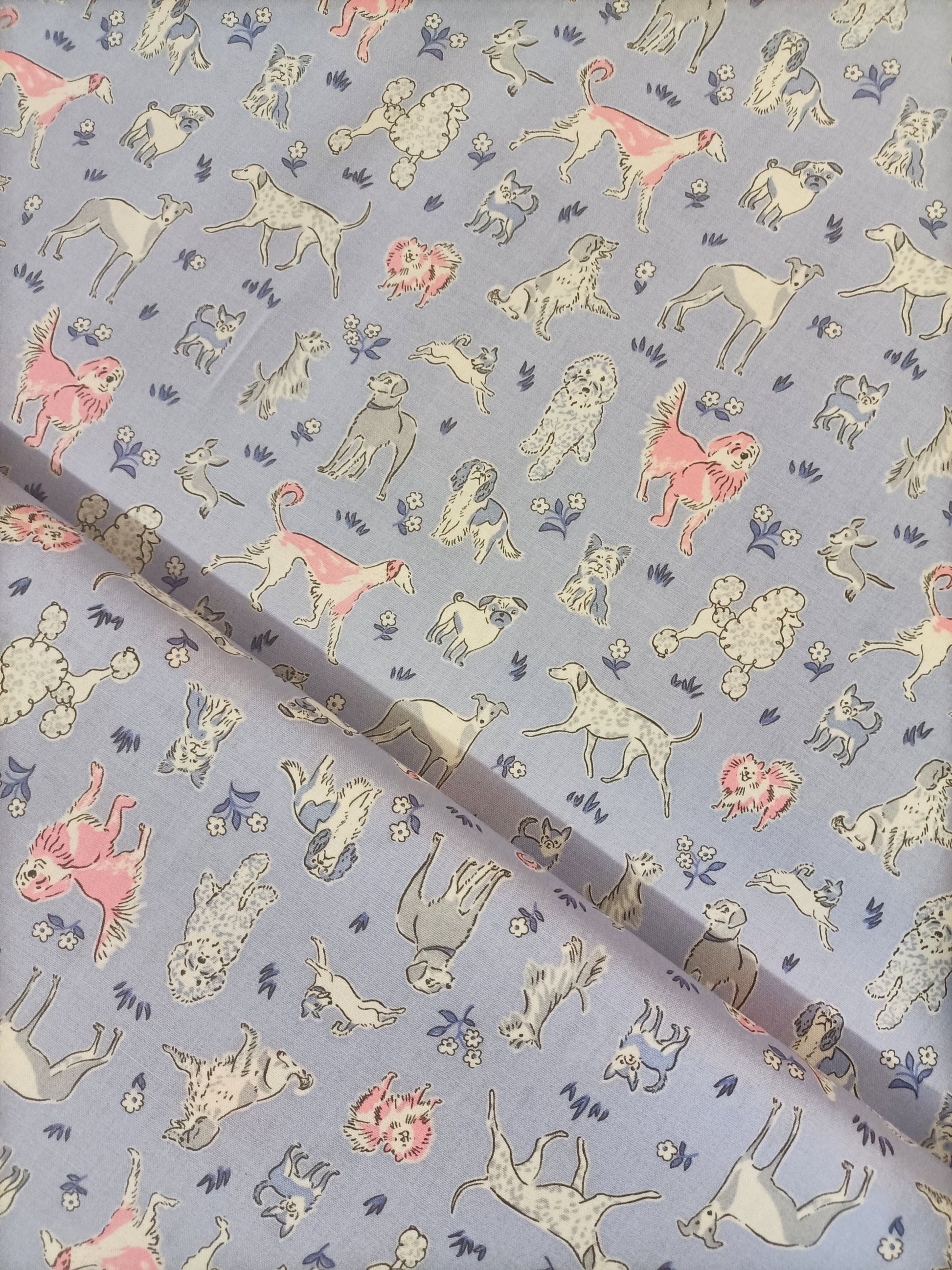 So many cute puppies! This fabric has a pattern of different types of dogs with a few daisies and grass, in blue-mauve, grey, white and pink, on a pale blue-mauve background.