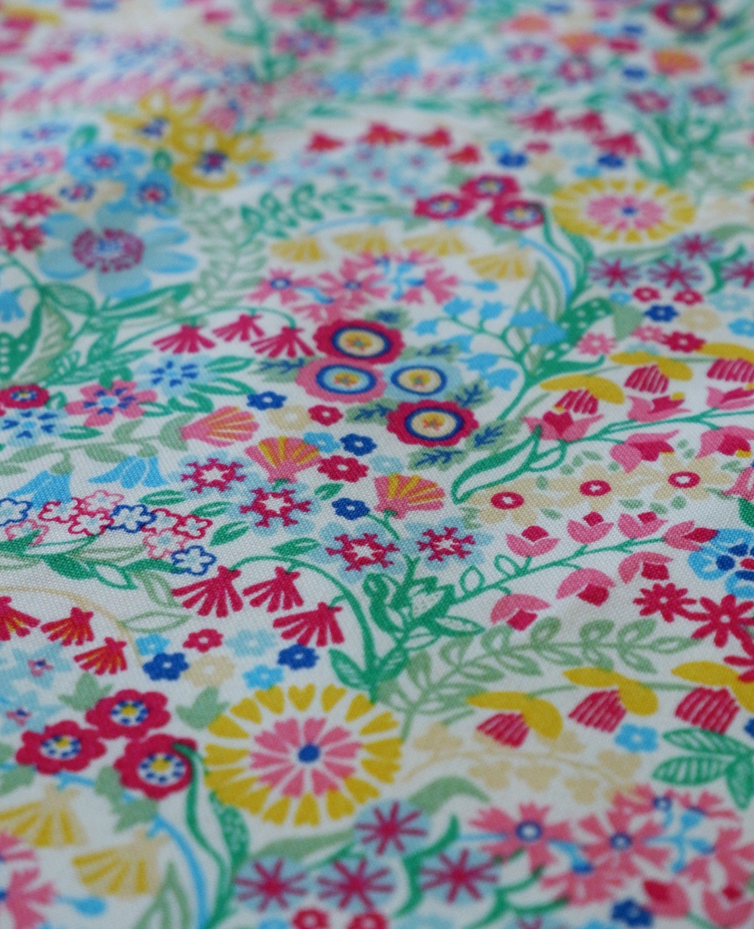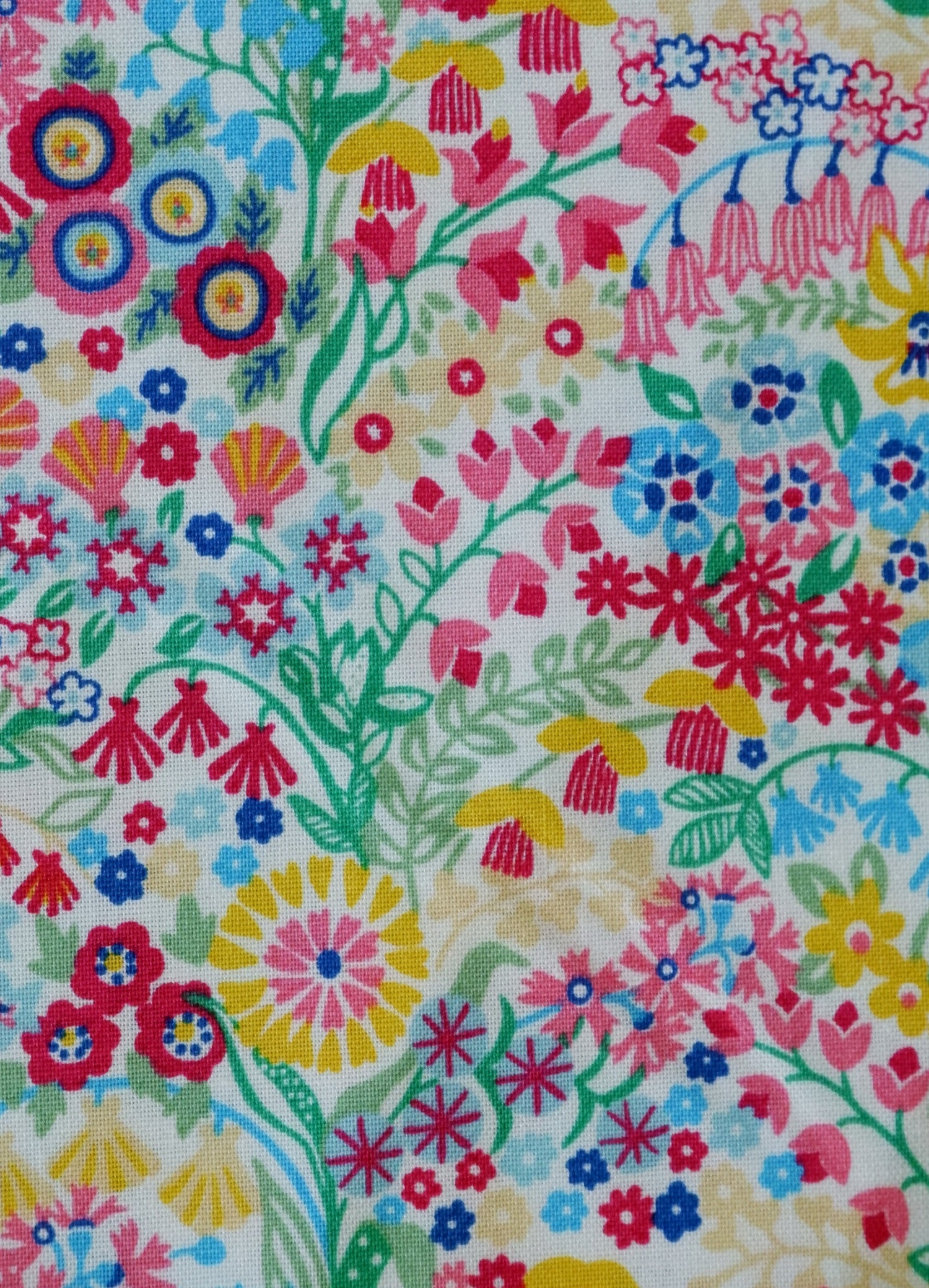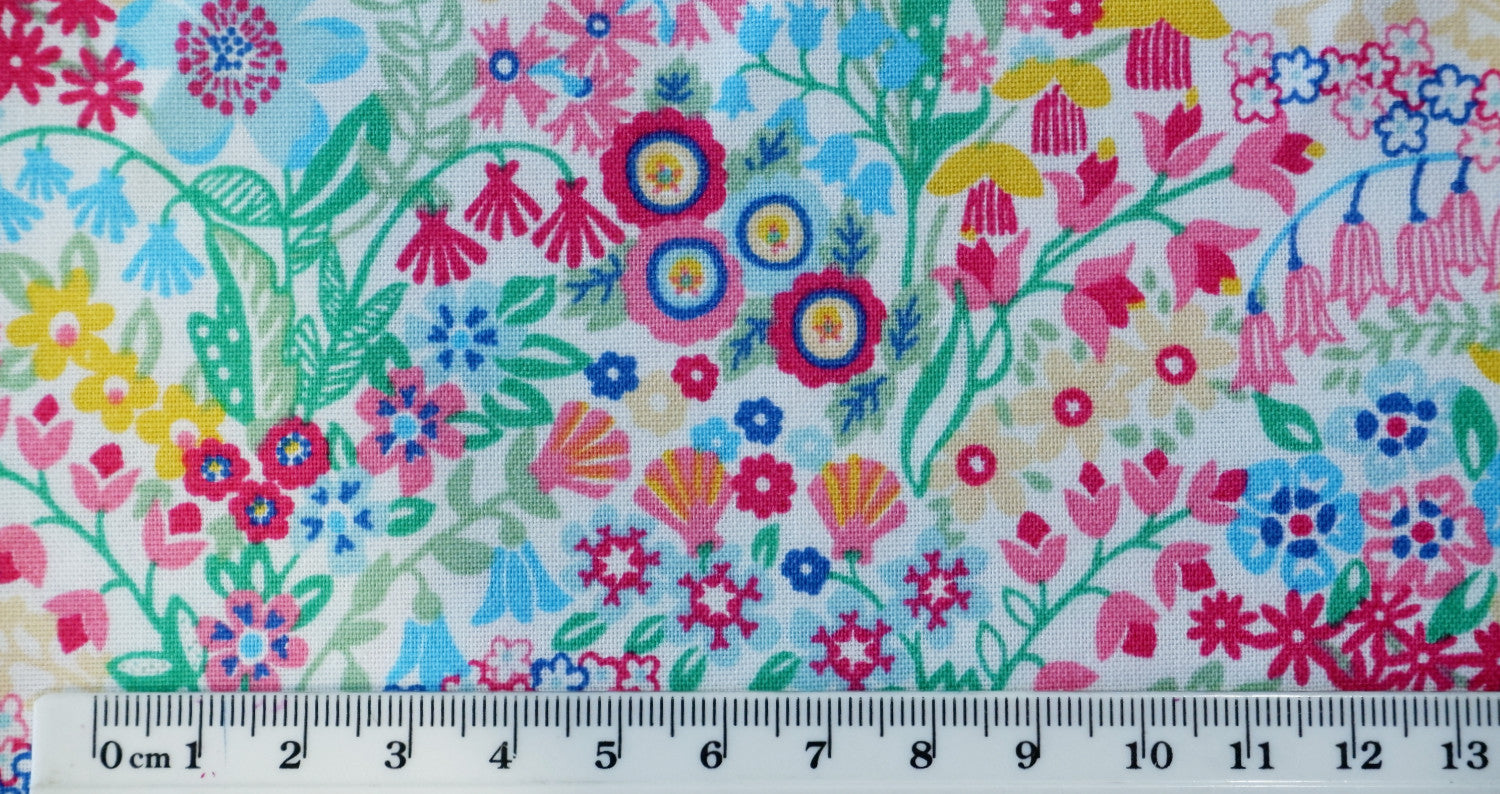 This fabric has a busy, bright and beautiful floral pattern of bold and light pinks, blue, green, and yellow flowers on a white background.