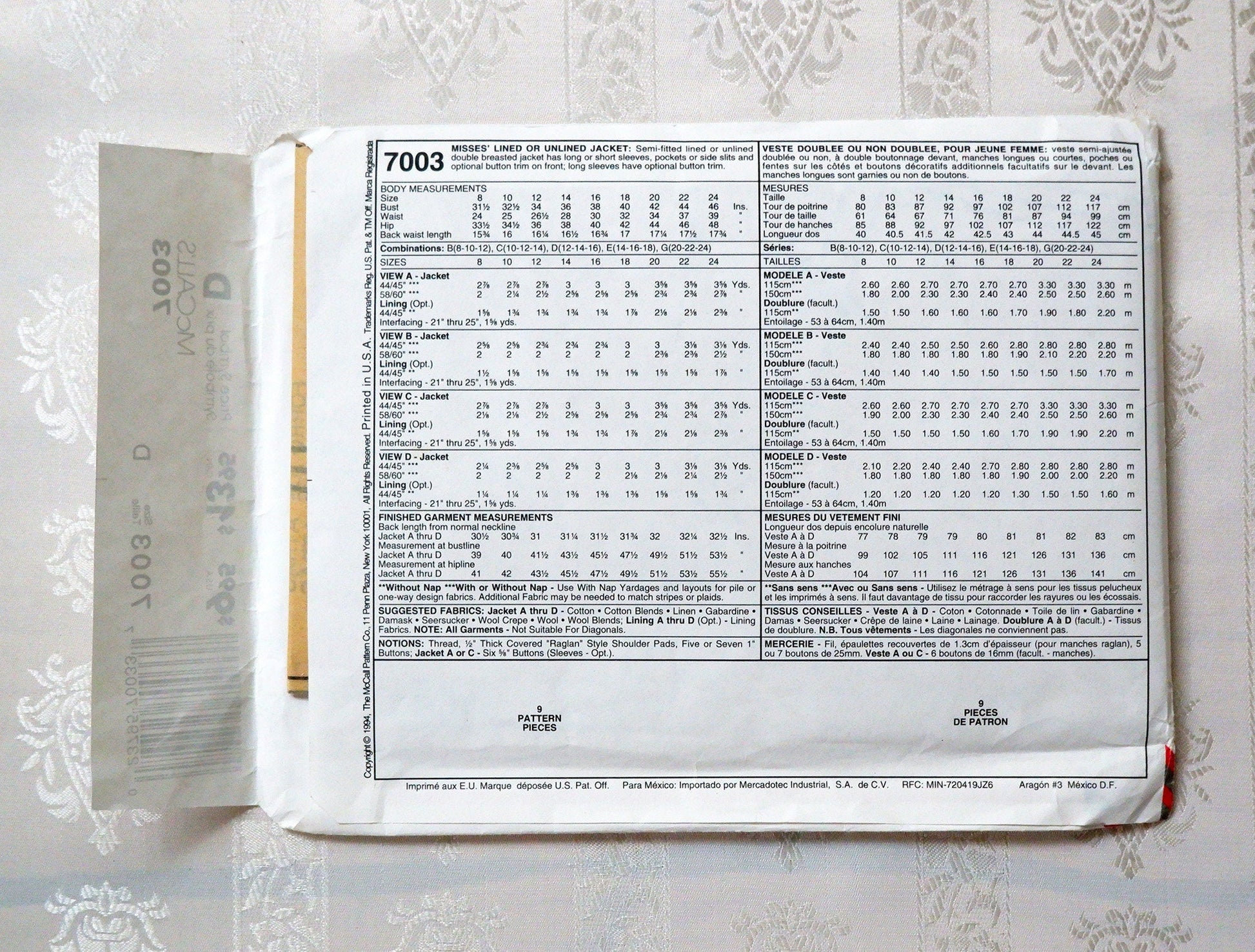 McCall's 7003, jacket pattern, sizes 12 - 16
