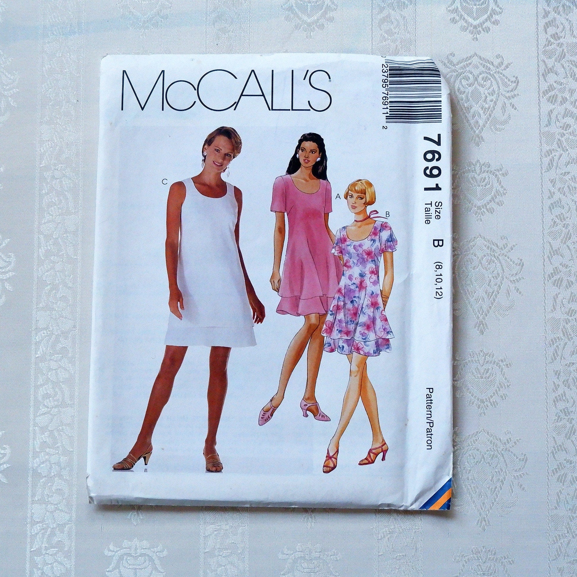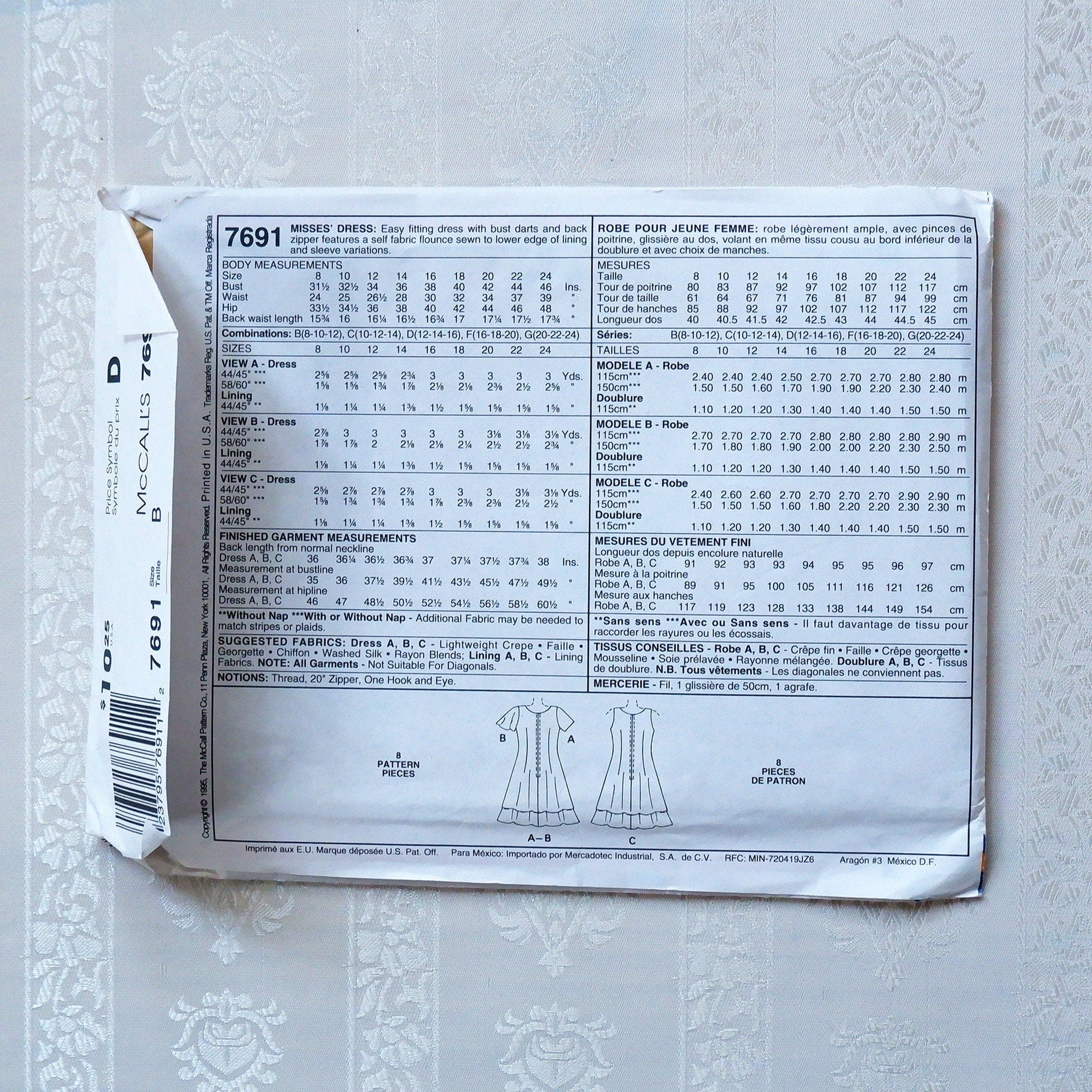 Easy fitting dress with bust darts and back zipper features a self fabric flounce sewn to lower edge of lining and sleeve variations.
