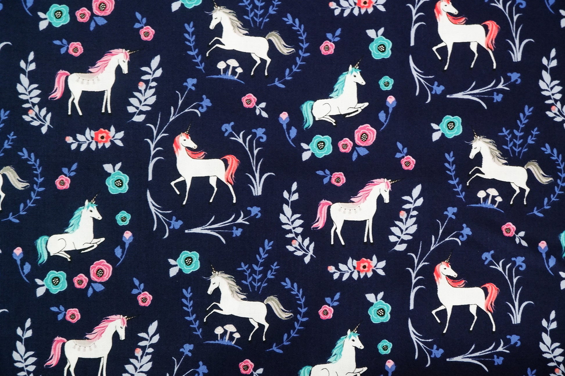This beautiful dark blue fabric, adorned with enchanting unicorns and whimsical floral elements, makes an eye-catching choice for your next project.
