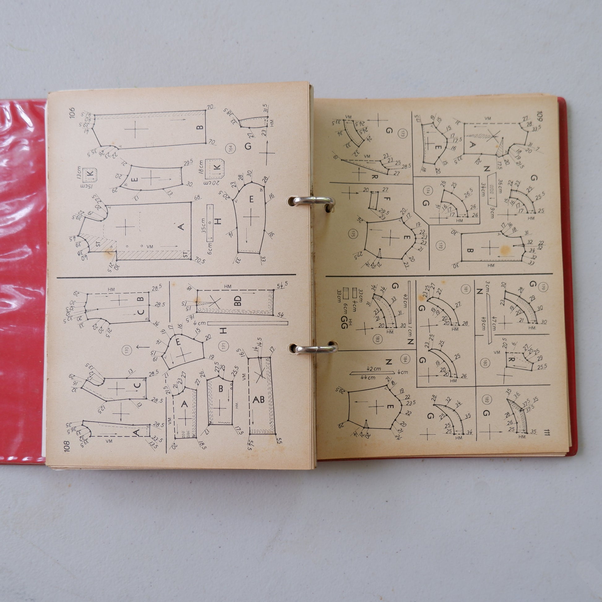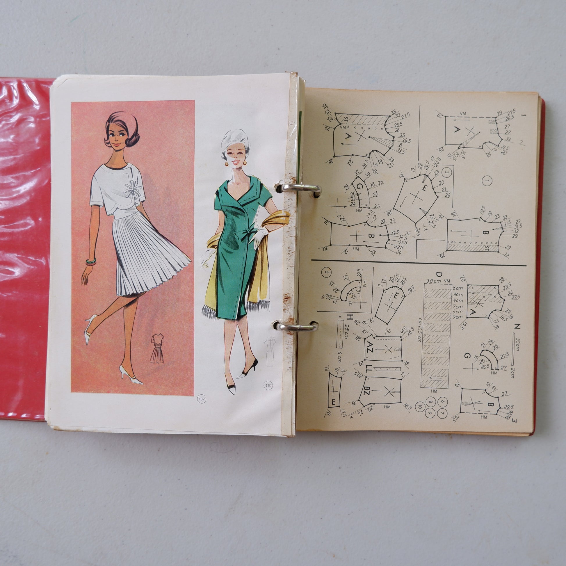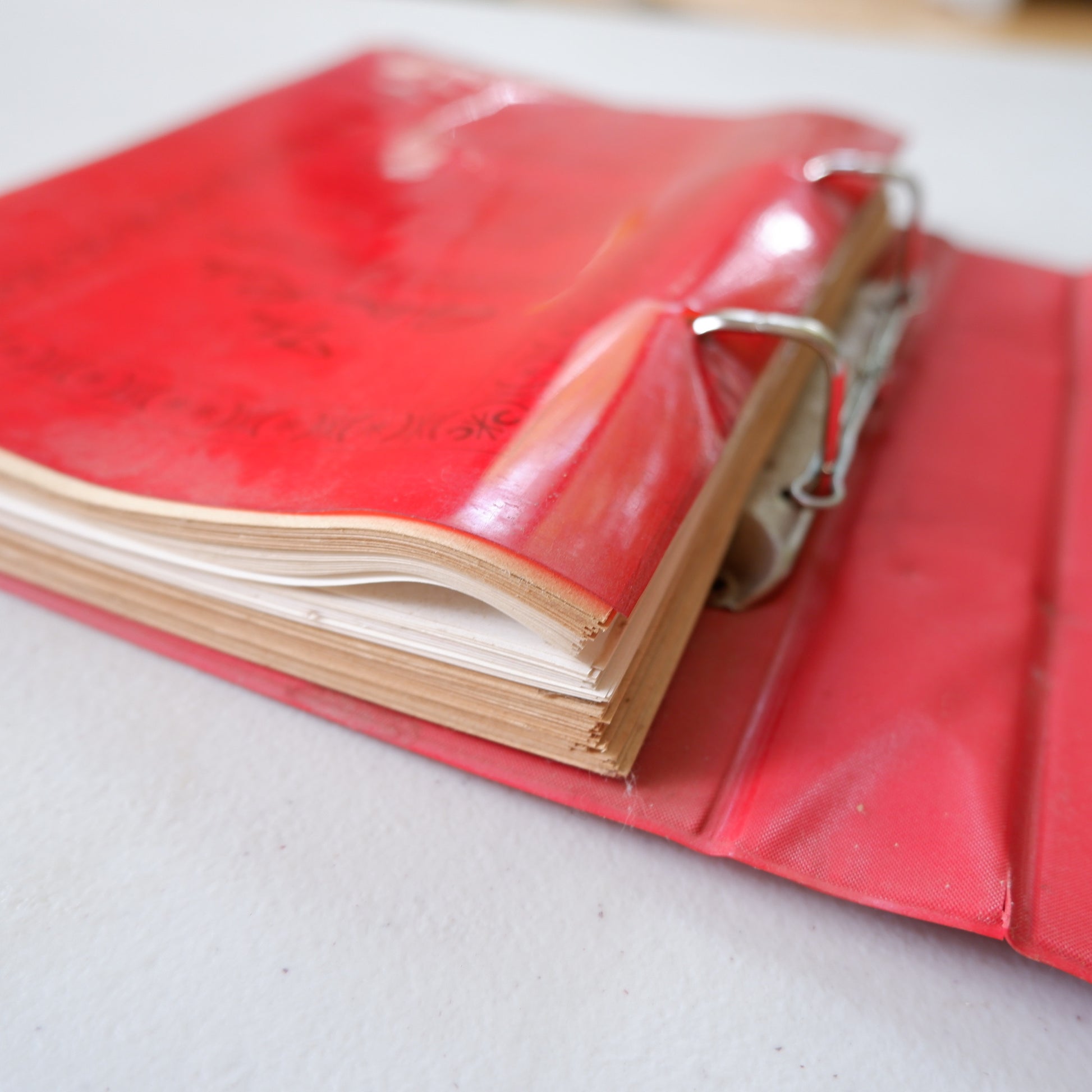 There is some age wear and tear, see photos of slight damage to the ring binder, pages not 100% flat, and age spotting on the text pages. A few pages have tape along the inside edge to stop ripping through the binder rings.