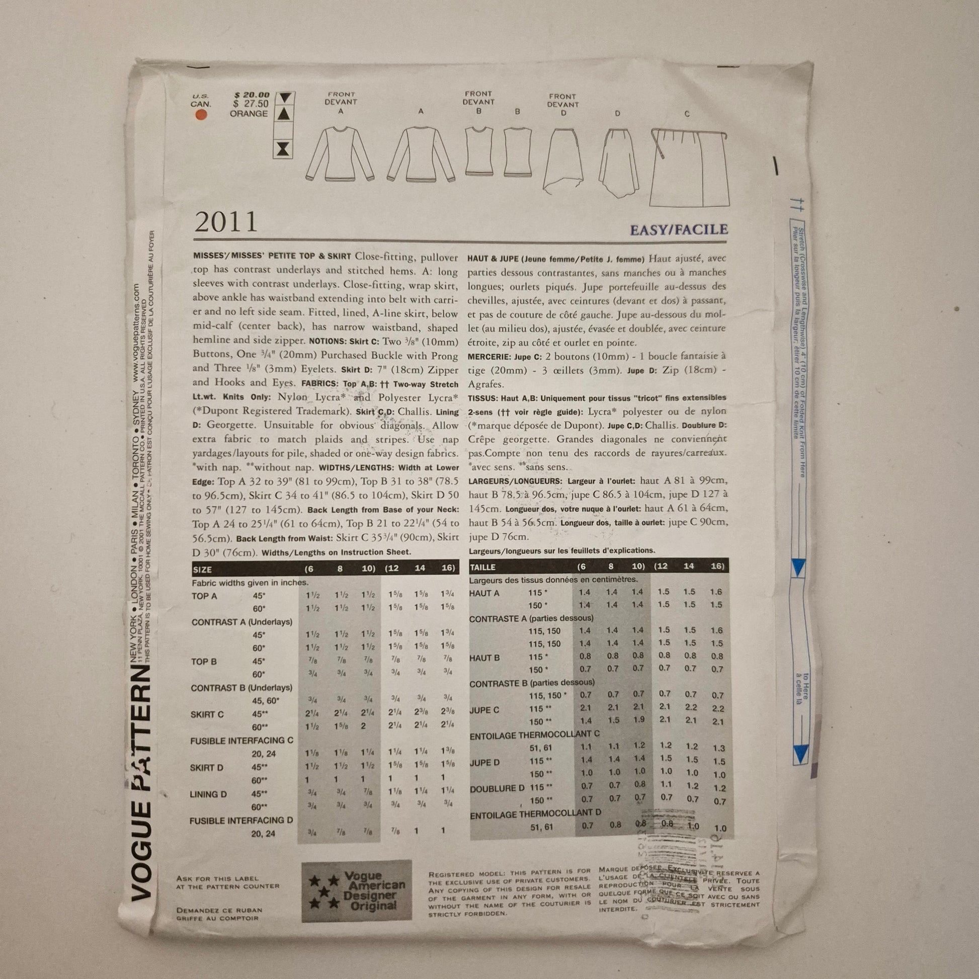 Vogue 2011, top and skirt pattern. Sizes 12 - 16